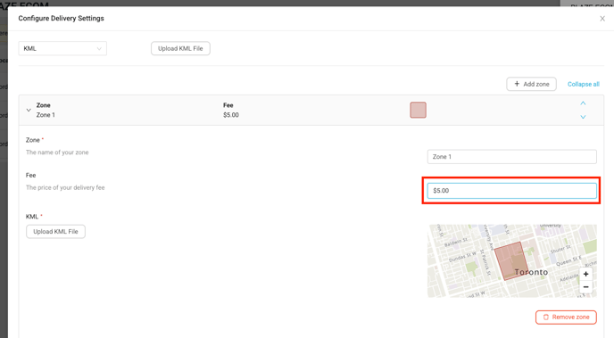 Set up your delivery zones for your BLAZE ECOM menu by either using: KML-Based (Drawn Map) Zones, Flat Rate Delivery, or Postal Code Restrictions.