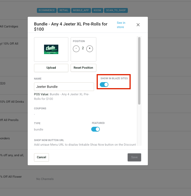 When Show Blaze Site Enabled Deals is enabled in BLAZE Sites on the Deals widget, this will display the corresponding enabled deals in ECOM Mission Control.