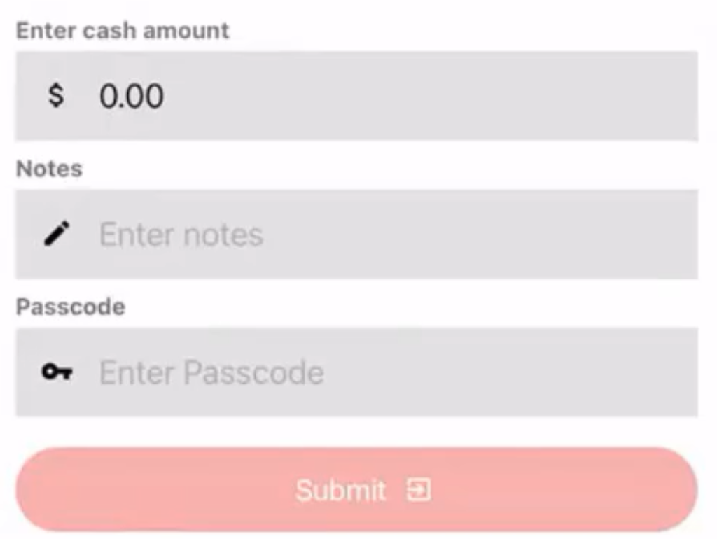 For any cash movement action, except the "No Sale", the salesperson will be required to enter the cash amount and their employee passcode prior to performing a cash movement.
