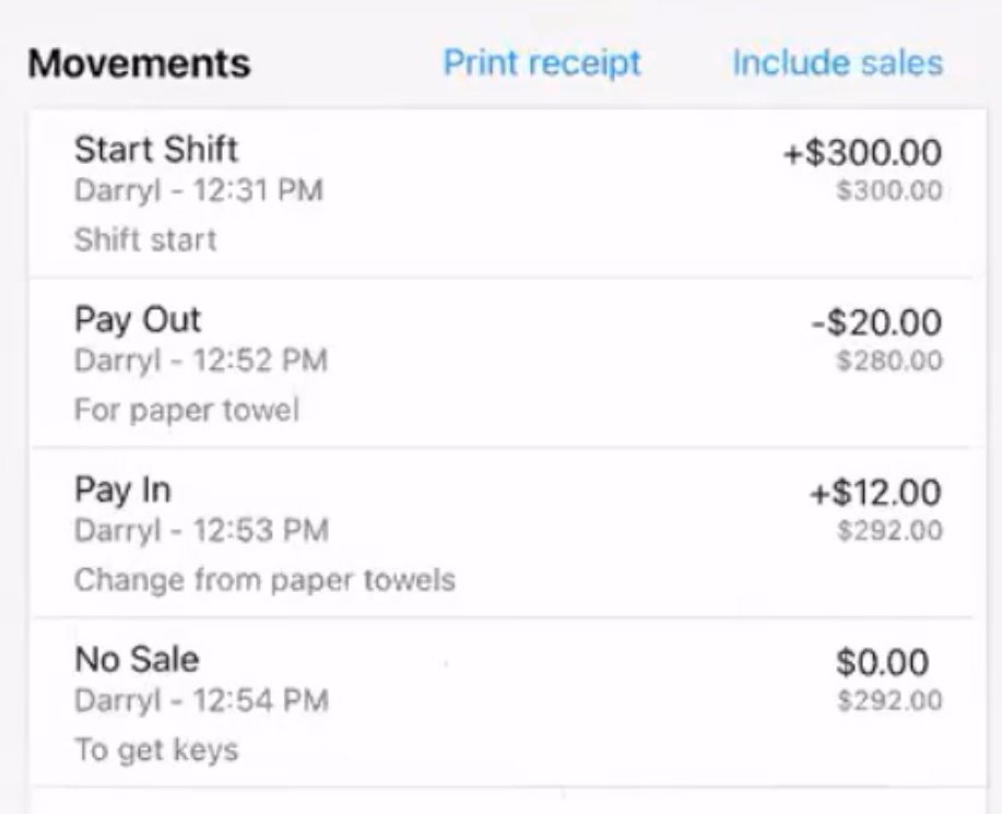 On the right side of the screen, you can review the cash movement history, print a shift receipt, and include all the sales that occurred during the shift.