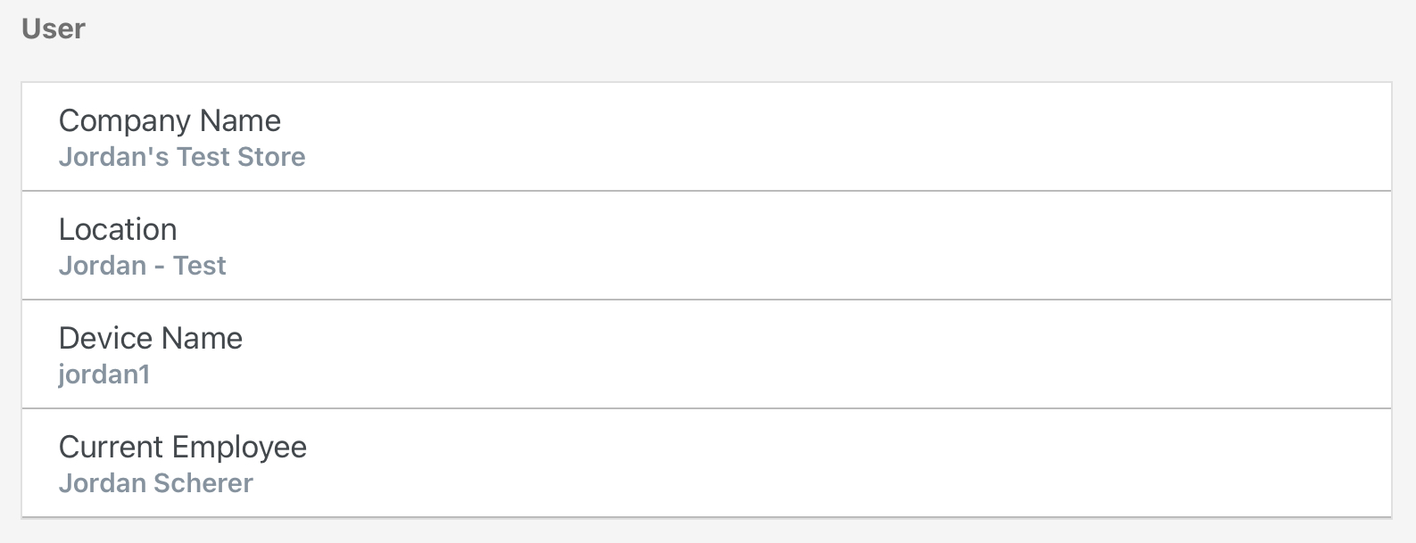 Here you can see the Company Name, Location, Device Name, and the Current Employee logged-in to your device.