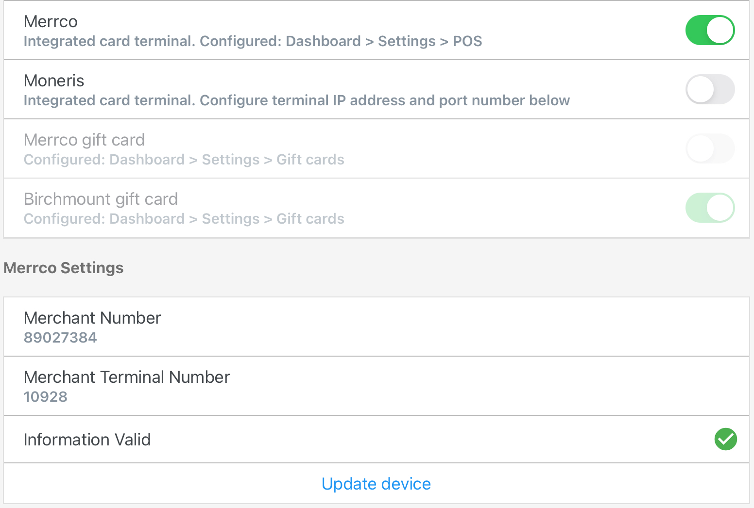 To use the Merrco integration, information must be set up in the dashboard and the payment option turned on in the POS device. Once it has been properly connected, a green checkmark will appear in the “Information Valid” box to indicate the connection status.