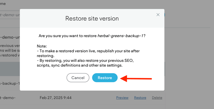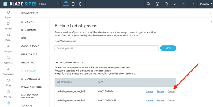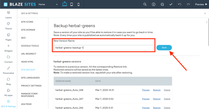 You can save copies of your site called backups. Backups allow you to restore to them at any point in time. While our system automatically creates backups each time a site is published, it is recommended to create manual backups of your site periodically instead of relying on the automated backup system in place.