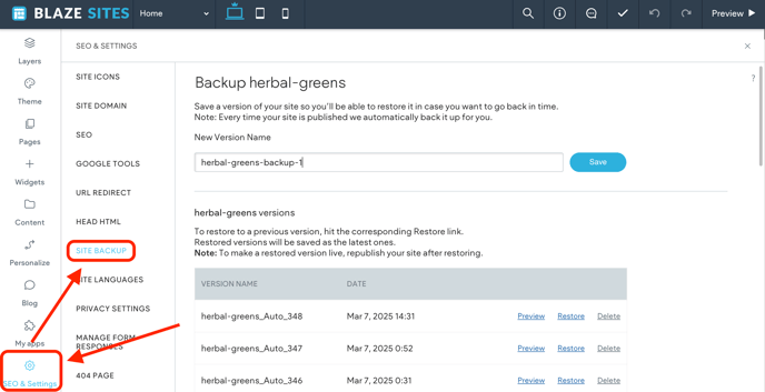 1. In the left panel, click SEO & Settings, and then click Backup Site.