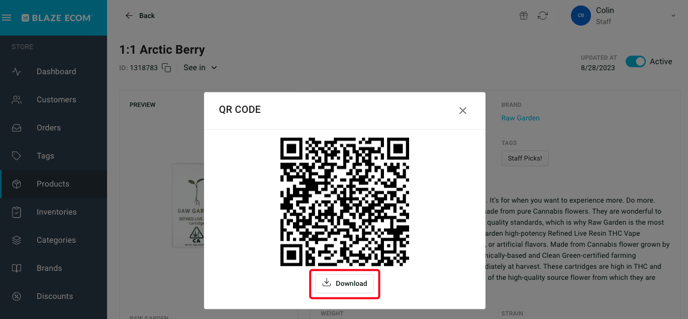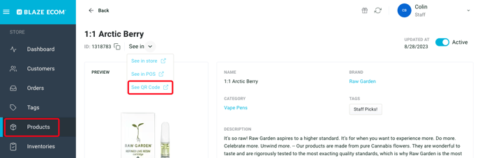 • Once the Scan to Shop has been enabled to your ECOM menu(s), head to the Products tab in Mission Control and click the See in dropdown to download the product's QR code.