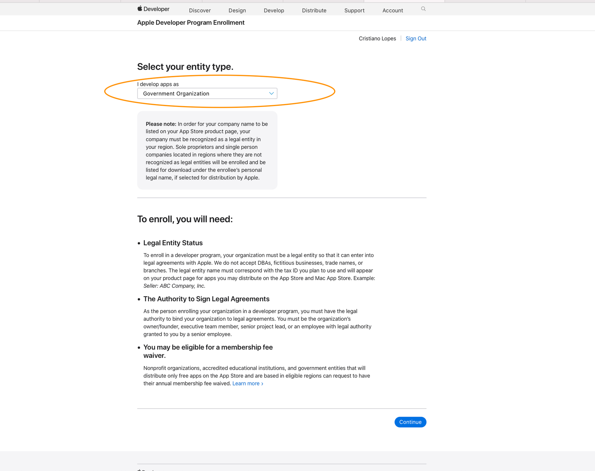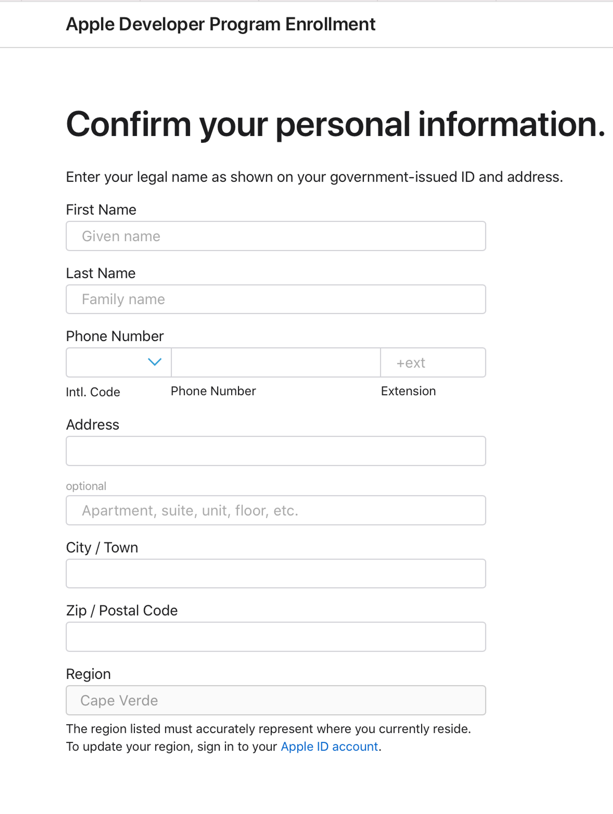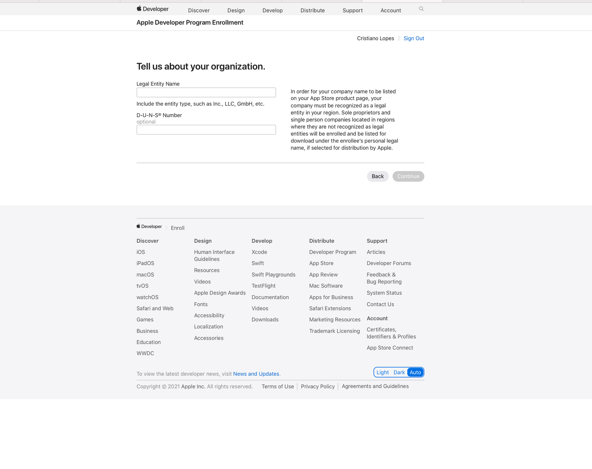 Go to https://developer.apple.com/enroll/ and login with the previously created Apple ID.