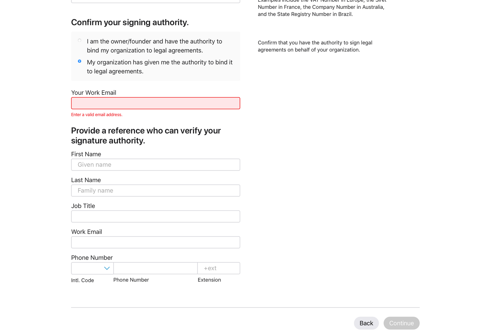 If you select delegated powers (My organization has given me the authority...), you will need to provide a reference to a person in the company that can attest to delegating powers to you. Apple will call the reference to verify.
