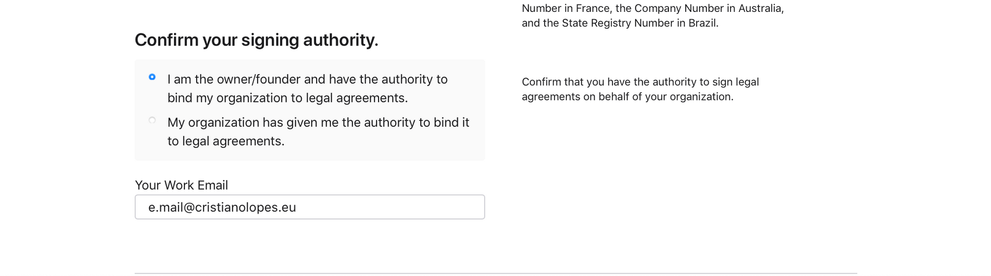 Pick full autonomy (I am the owner/founder and have the authority...) and you will not need to provide a reference contact that validates if you are mandated to complete the process. We recommend this option.