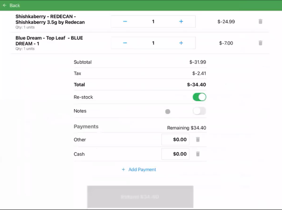 Once enabled the system will automatically re-stock cannabis products once they are refunded. There will no longer be a manual "restock" toggle on the POS required.