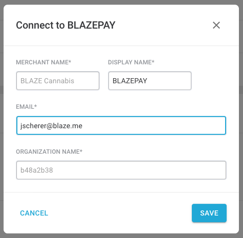 - You will be prompted to enter your email and you can change the display name of the payment method. The merchant name (location name) and organization name (company name) will automatically be set for you.