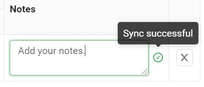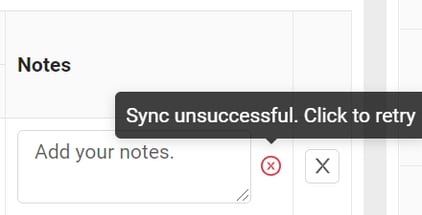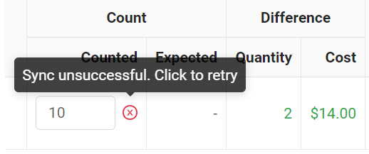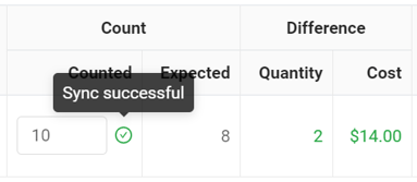 To sync values in the audit, click anywhere outside the "Counted" or "Notes" fields. Or click on the icon to force-sync values. You will see the exclamation icon change to a green checkmark to indicate that the information was successfully added to the audit.