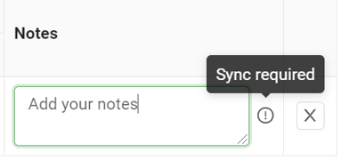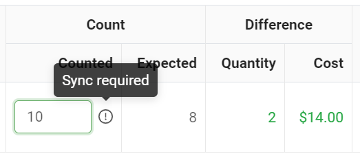 Ensure your values are successfully added to the audit. When you enter a value in the "Counted" or "Notes" columns, you will see an exclamation icon to notify the user that sync is required to account for the information.