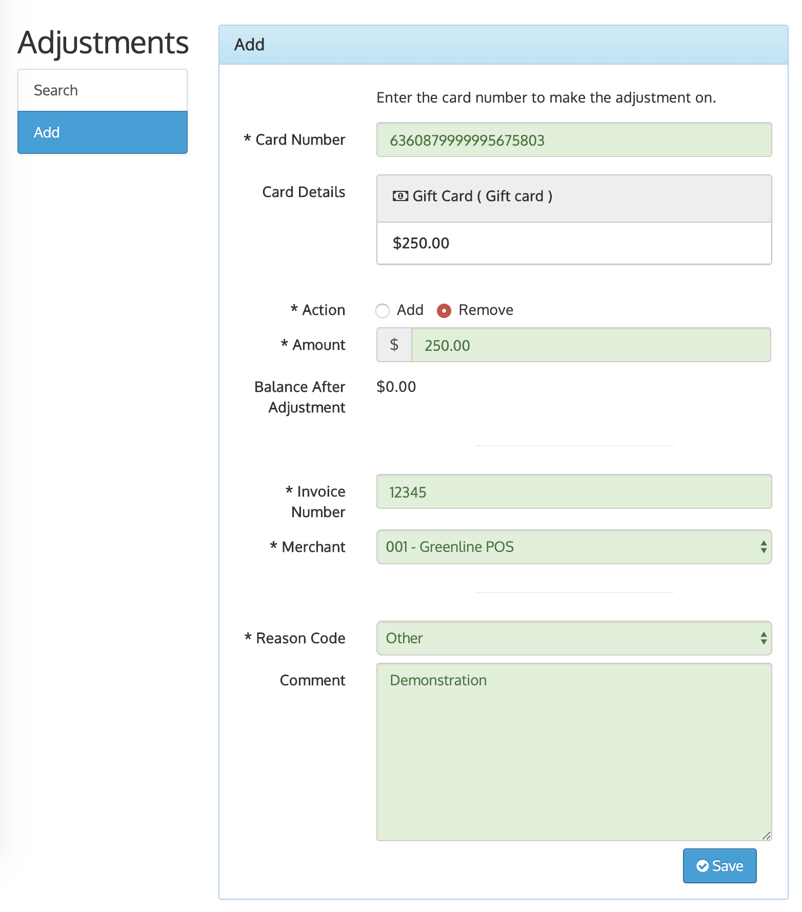3. Adjust the Merrco gift card amount so that the Balance After Adjustment is $0.00 and click Save.