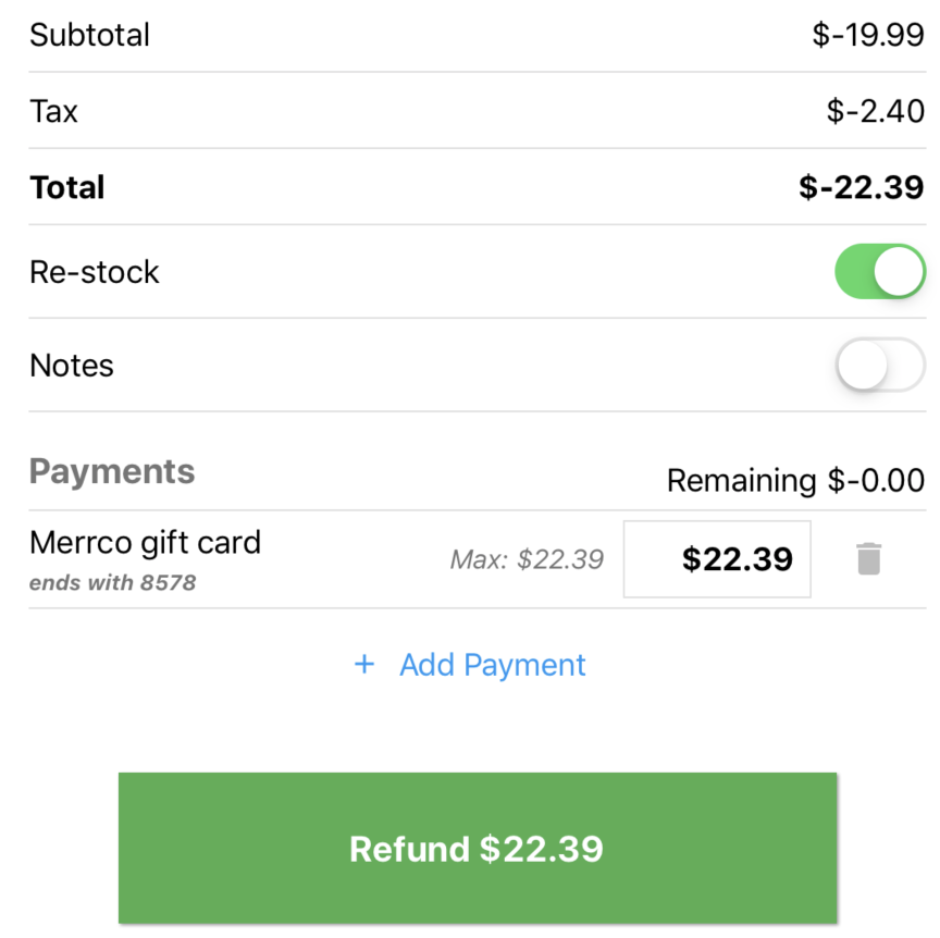 If a sale was made using a Merrco gift card you will be able to refund the original sale amount back to the gift card.