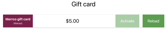 1. 1. After you enter in the Merrco gift card dollar value, you will see the dollar amount alongside the Activate and Reload options. The Activate button appears in a darker green while the Reload button appears in a lighter green.