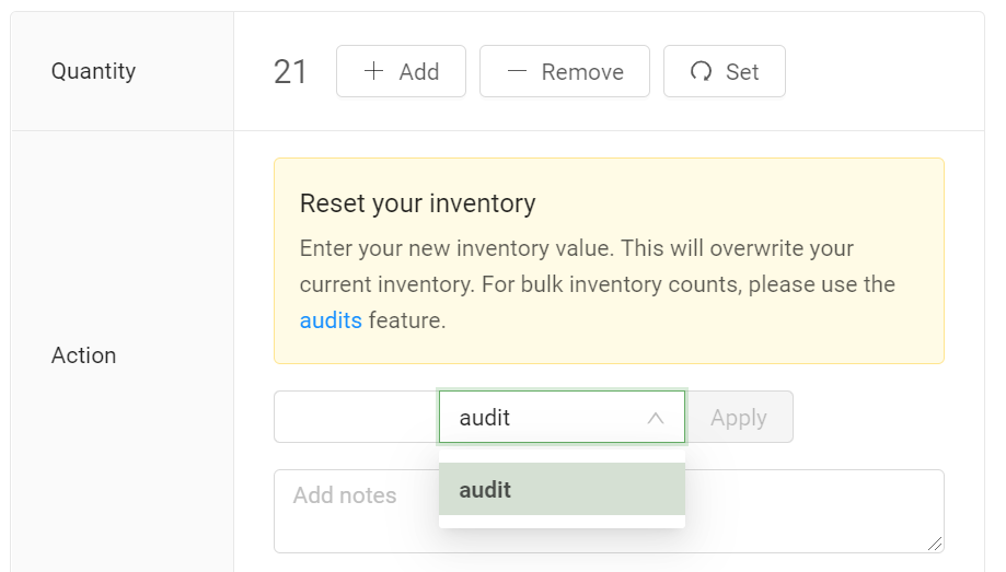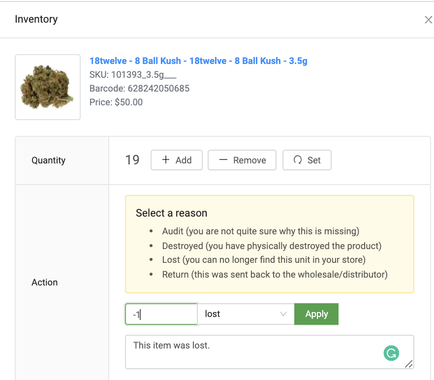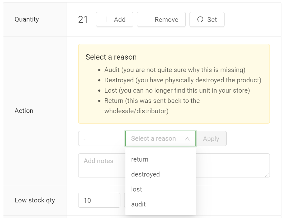 2. Click on the “Add, Remove or Set” button and enter the product quantity change.