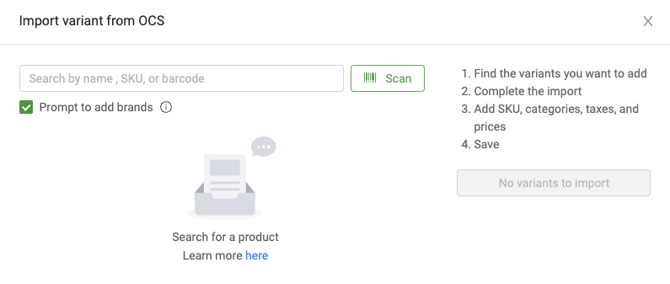 If you are operating outside of BC, AB or ON, you only have the ability to search by name or barcode and will have to enter the SKU, category, taxes and retail price of the product you select from the Greenline catalogue.