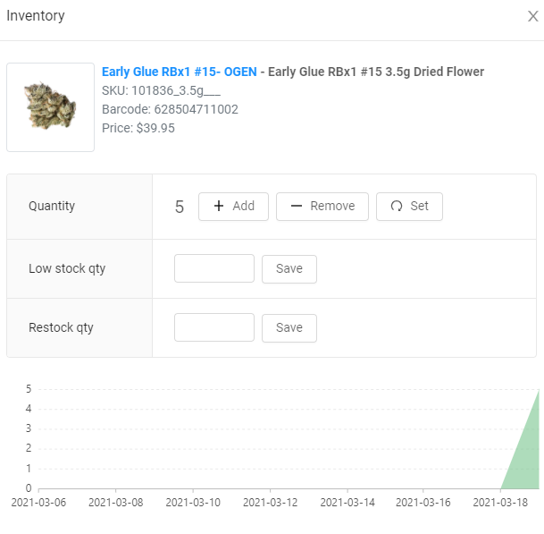 TIP: If you go to Inventory > Overview on your dashboard, you will notice that the placeholder location now has negative inventory for the SKUs that you just transferred over. If you would like to bring the inventory value to 0 simply click the cell with the value. This will bring you to an Inventory overview pop-up of the SKU. In the Quantity row, you are able to adjust the quantity by adding, removing, or setting the products. The simplest way to bring this to zero is by clicking the set button which will is located in the Action row. Here, you can enter 0 and click apply to bring the quantity back up. When conducting compliance reports do not include your placeholder locations in the reports as they do not carry actual inventory.